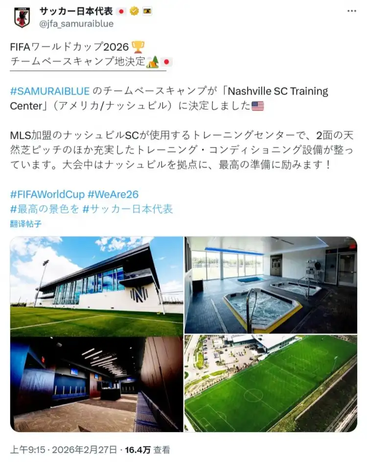 球探体育2月27日讯 日本队官方宣布,球队征战2026年世界杯的大本营正式确定为纳什维尔SC训练中心。