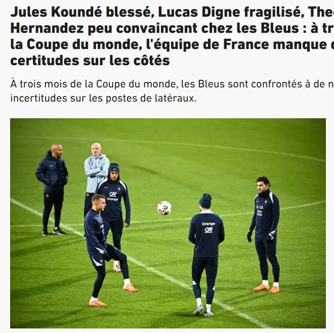 队报指出:高水平边后卫的系统性培养,在法国长期未能破题。近年来,尤其是右后卫位置,国家队教练组屡屡被迫征召中后卫临时客串。而如今距世界杯仅剩不到三个月,已无暇临时拼凑——取而代之的,是愈发明显的不确定性。