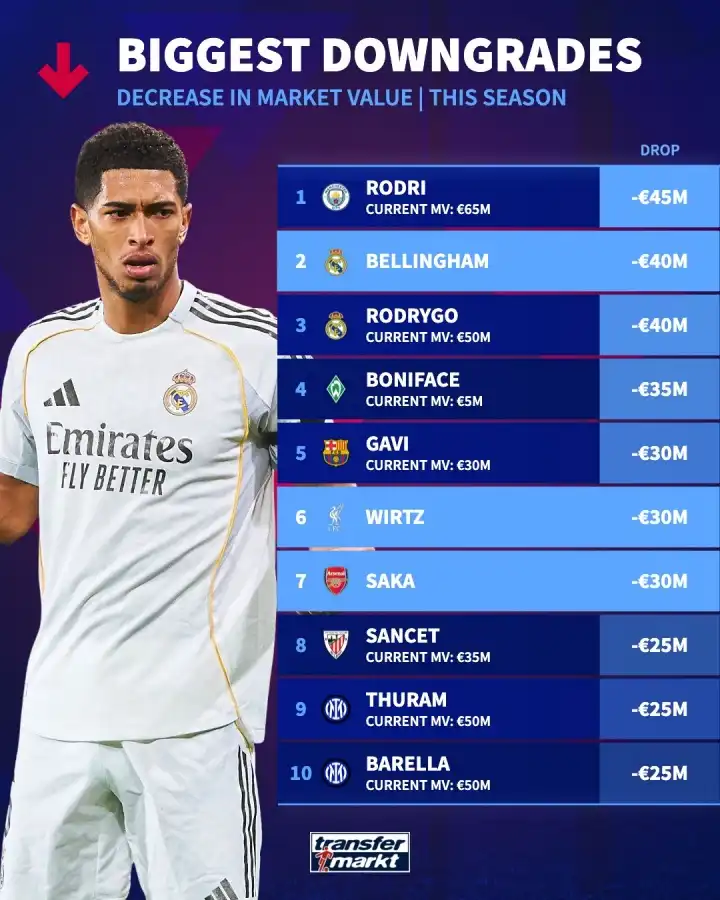 球探体育03月31日讯 德转近日更新了本赛季球员身价变动榜单,罗德里以4500万欧元的跌幅位居身价下跌榜首位;贝林厄姆与罗德里戈并列第二,各自身价均下调4000万欧元。